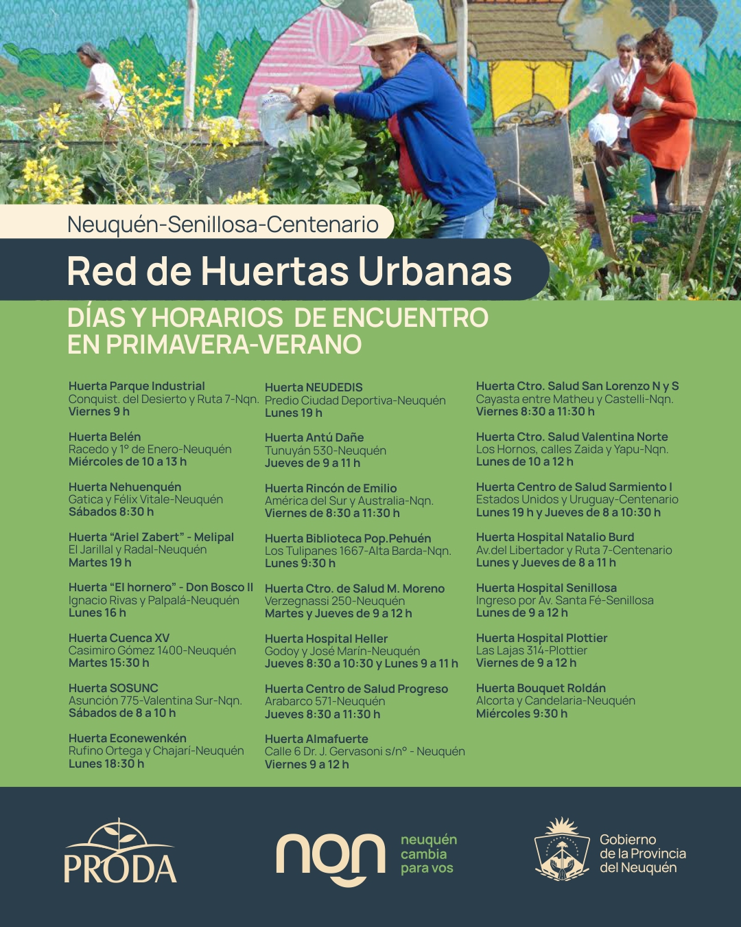 Aquí podrás acceder a la ubicación y días de reunión (por temporada), en cada una de las huertas urbanas que el programa PRODA desarrolla junto a otras instituciones, organizaciones sociales y familias huerteras de la zona Confluencia.